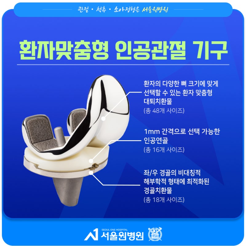 우선 서울원병원은 환자 맞춤형 인공관절을 제공한다. 서울원병원은 수술 경험이 풍부한 원장이 환자의 자세한 병력 청취와 면밀한 신체검진을 하기 때문에 무조건적인 수술이 아니라 수술을 하는 경우 역시 각 환자에게 맞는 인공관절기구를 제공한다. 환자는 정말 천차만별이다. 이를 위해 서울원병원에서는 다양한 뼈 크기에 맞게 선택할 수 있도록 총 48사이즈의 대퇴치환물/1mm 간격으로 선택 가능한 16가지 연골크기/좌우 경골의 비대칭적 해부학적 형태에 최적화된 18사이즈의 경골치환물을 보유하고 있으며, 그때마다 정밀한 환자맞춤형 인공치환하고 있다.